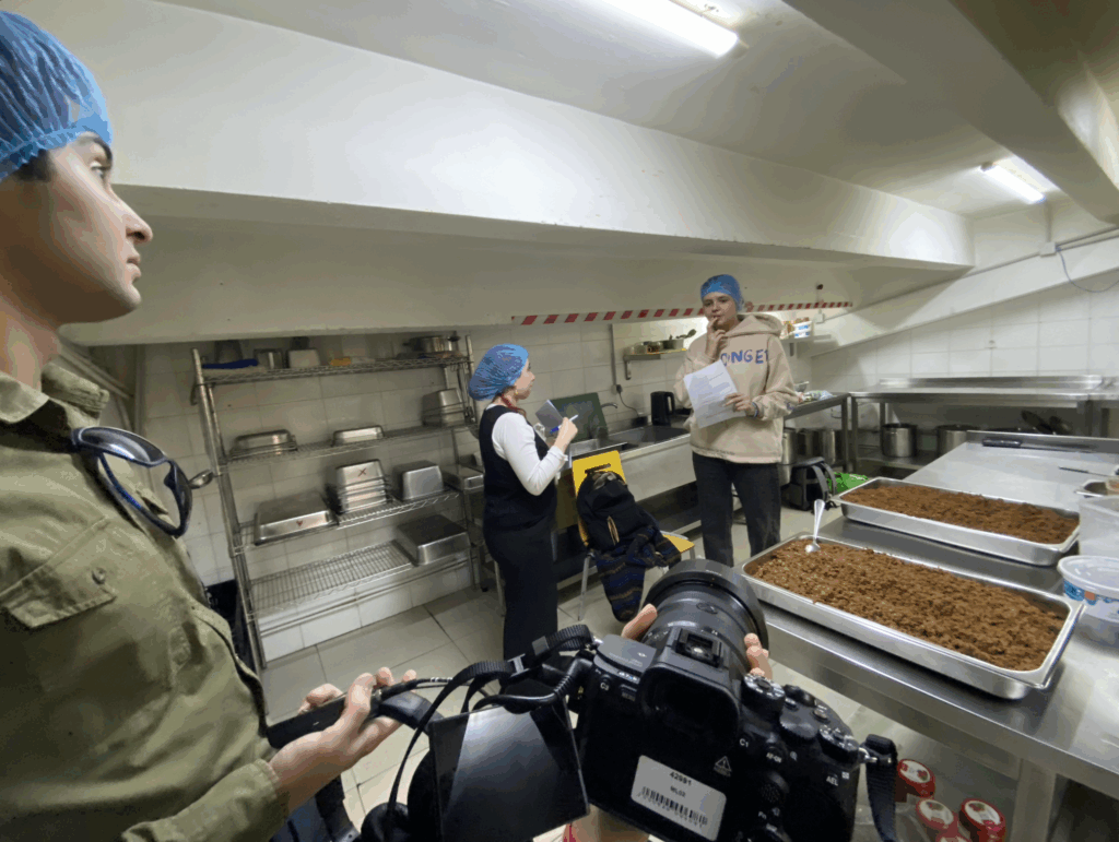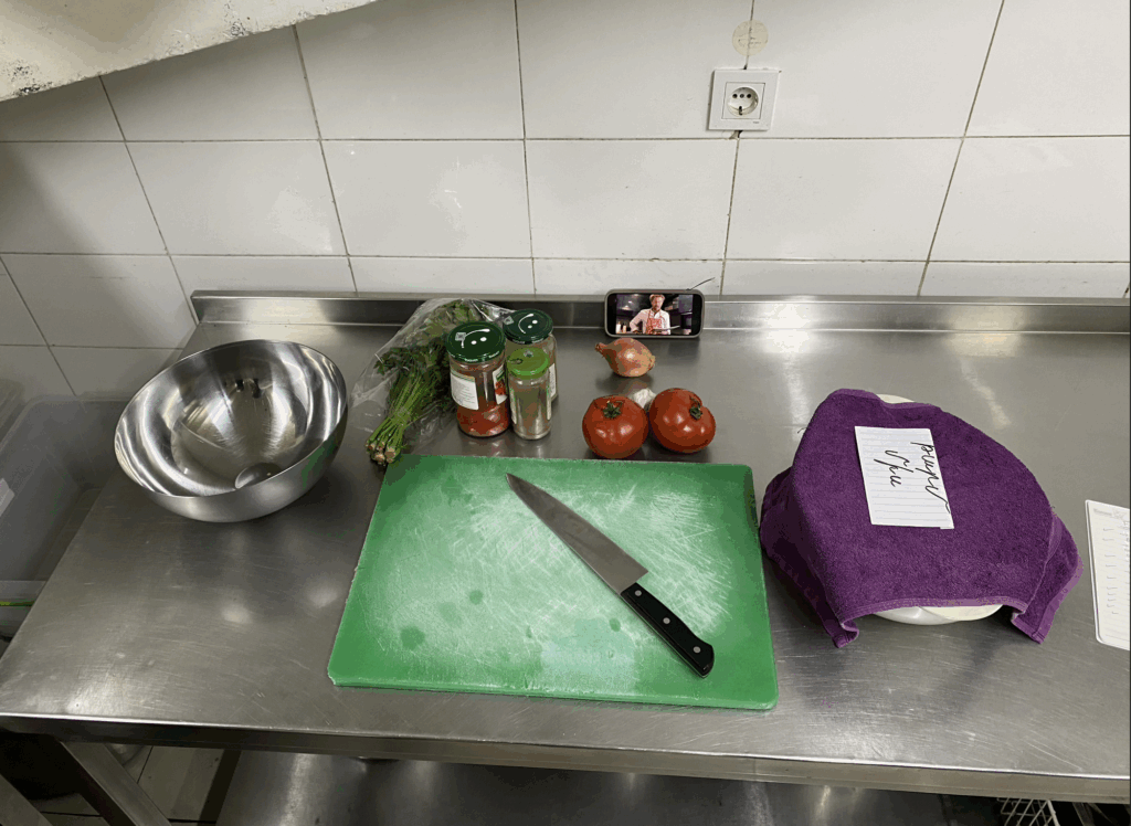 On the second day of the shoot, we felt more comfortable. And we had this funny set-up with the sound – we didn’t need the Zoom recorder which was only needed for two actors (we only shot one that day), but my teammate had to hold the receiver attached to the camera and use the headphones, sticking next to me the whole time (I called it our ‘caterpillar rig’ xD). The headphones were buzzing with feedback that day and for the rest of the shoot (probably because of all the kitchen equipment humming with all sorts of radio signals), and we didn’t have time to fix it.