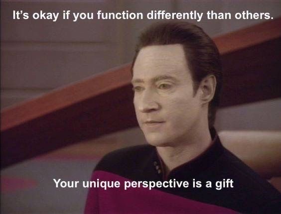 Girl, I could relate to that as a third culture kid (TCK). I guess that’s why I love Data—he learns and learns to be human, but he can’t fully be. Though, we love him for trying. It’s like how I try to be more Armenian, try to learn the languages in countries I visit, and even try to learn the slang in my home country to fit in. But in my heart of hearts, I know I don’t fully belong still. [And I guess my social anxiety mainly stems from my position as a TCK.]