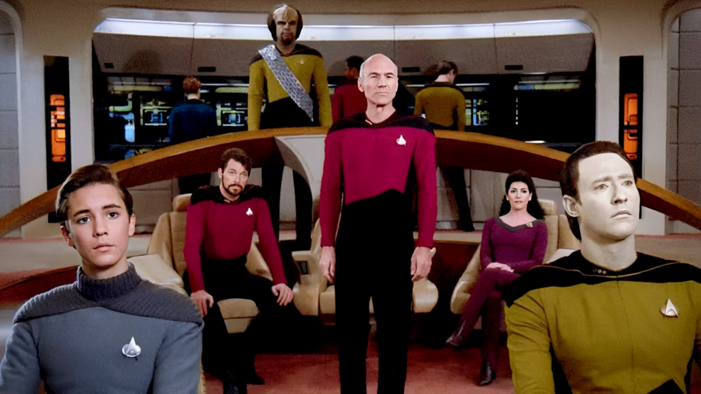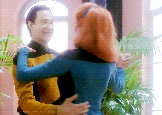 But his curiosity is matched by his great ability to bounce back from his mistakes and social gaffes. He makes that sort of “oh, okay.” face, after someone corrects him – like his best friend Geordi, or Riker (below).