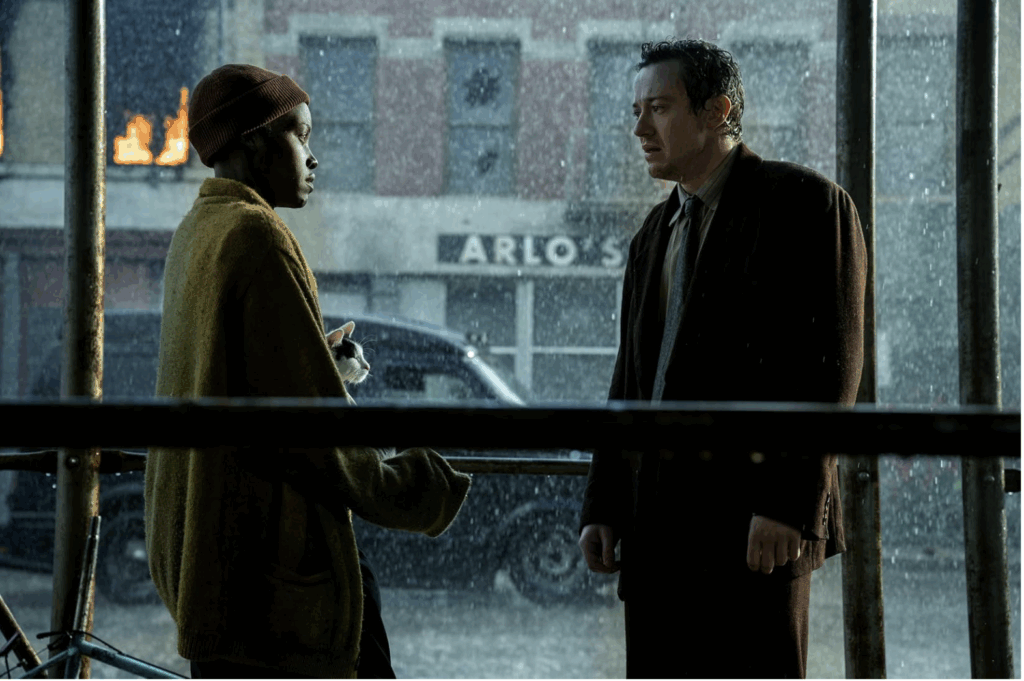 We go back to Sam, and Eric (Joseph Quinn’s character) is literally “look what the cat brought in” ๐คฃ and Eric follows them like a stray cat as well. Sam tells him to go away (so cute) when they shelter from the rain under one of those New York scaffolding roofs (a great plot device so they can talk freely, like the waterfall in the first film). Well, he’s super scared and doesn’t want to leave for the boats alone, so he stays with Sam.